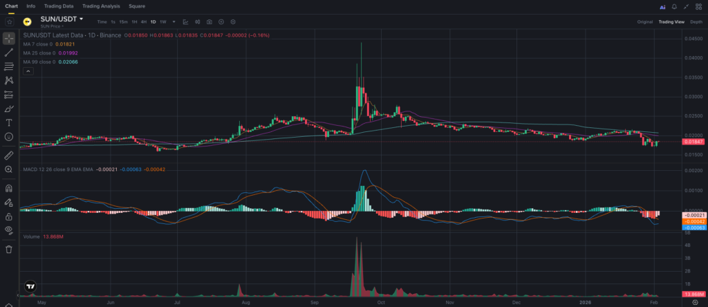 This technical analysis is based on the 1D timeframe. The latest completed candle is February 3, 2026, 02:00 UTC. On the daily chart, SUN remains in a descending structure, with a clear sequence of lower highs and lower lows formed after the sharp rally seen in early autumn.