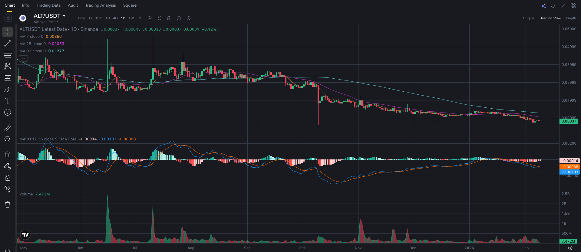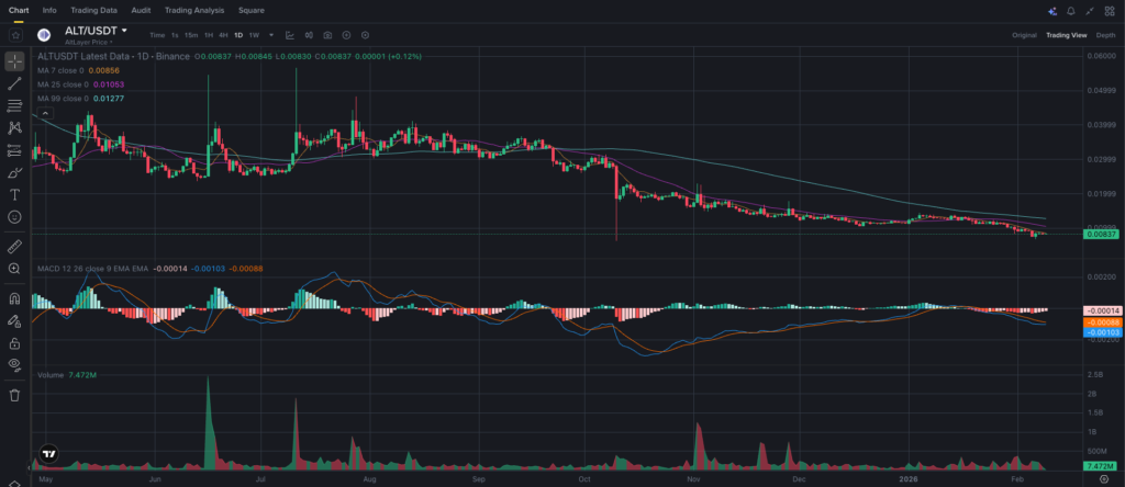 Технический анализ ALT выполнен на таймфрейме 1D. Последняя сформированная свеча — 9 февраля 2026 года, 02:00 UTC. На дневном графике сохраняется нисходящая структура с последовательностью lower high и lower low, сформированная после пиков середины прошлого года.