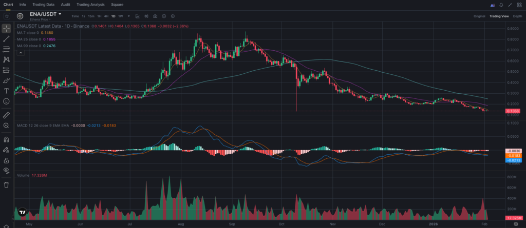 Технический анализ ENA выполнен на таймфрейме 1D. Последняя сформированная свеча — 3 февраля 2026 года, 02:00 UTC. На дневном графике отчётливо сохраняется нисходящая структура с последовательностью lower high и lower low, сформированная после пика в конце лета.