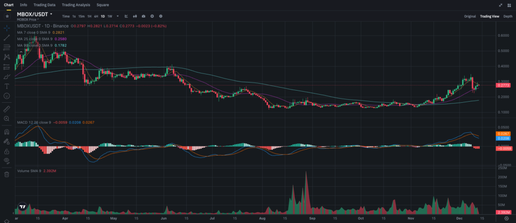 После достижения локальных максимумов в 2021 году цена MBOX испытала значительные колебания, отражающие общий тренд крипторынка. Однако недавний рост цены после длительного периода консолидации внушает оптимизм.