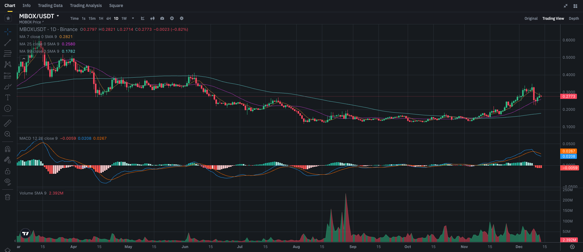 - MA 7: Цена торгуется вблизи $0,2773, что близко к MA 7 ($0,2821). Это указывает на слабую консолидацию с возможным движением вверх.