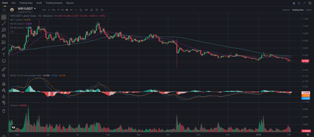 Технический анализ WIF выполнен на таймфрейме 1D. Последняя сформированная свеча — 3 февраля 2026 года, 00:00 UTC. На дневном графике сохраняется понижательная структура с последовательностью LH и LL, что указывает на доминирование продавцов в среднесрочной перспективе.